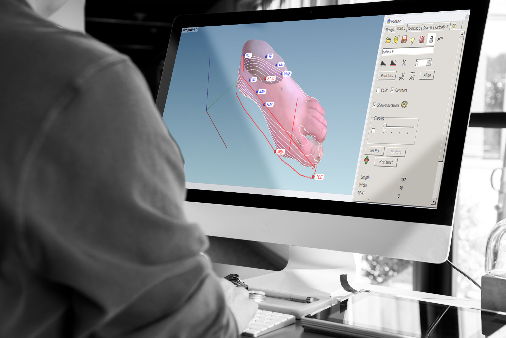 i-Shape heeft een unieke methode ontwikkeld waarbij het 3D scannen van een voet wordt voorafgegaan door het digitaliseren van een aantal anatomische referentiepunten en bissectrices. Hierdoor beschikt de podoloog over een unieke, vooruitstrevende en accurate methodologie voor het designen van functionele en accomoderende voetorthesen.